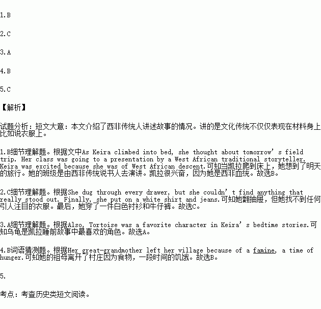 As Keira climbed into bed, she thought about tomorrow’s field trip. Her class was going to a presentation by a West African traditional storyteller. Keira was excited because she was of West African descent. Her great-grandmother had come to the United States from Senegal, a country in West Africa. Until now, Keira hadn’t thought much about her roots(根源).
