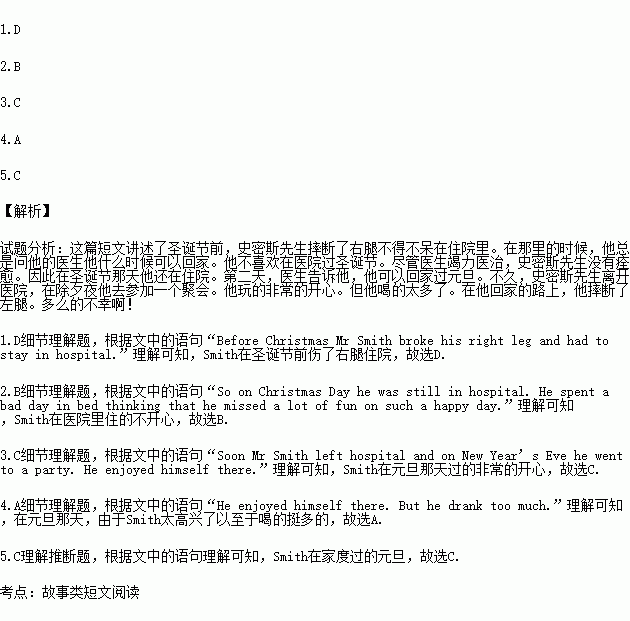 The next day the doctor told him that he might be well enough to leave hospital in time for the New Year. Mr Smith was very happy to think that he would spend New Year’s Day outside hospital. Soon Mr Smith left hospital and on New Year’s Eve he went to a party. He enjoyed himself there. But he drank too much. On his way home that night, he had a fall and broke his left leg. What a unlucky man he was!