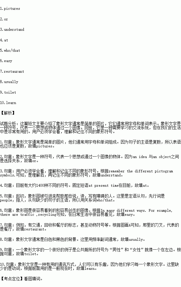The combination of white against a black background creates extremely contrast(对比), and this makes pictograms friendlier to users. A good example of a pictogram is the public 9. symbols for “Men” and “Women”, just like the one on the left. Pictograms are a useful method of communication, and people can have fun as they 10. each pictogram.