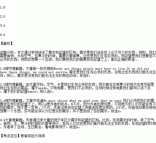 People are different, but they all have the same needs. Needs are things people must have to live. Our bodies need food and water. We also need air to breathe. We need a place to live to keep us safe. We need clothes to keep us warm. If we did not have these things, we could not survive(生存).