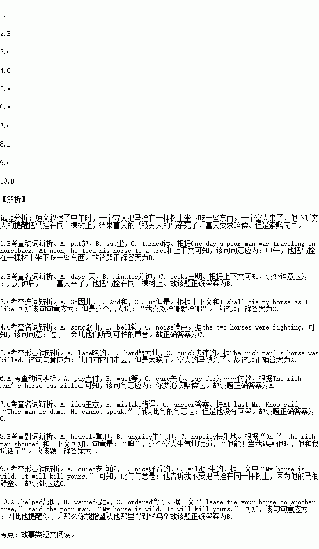 “Please tie your horse to another tree,” said the poor man. “My horse is wild. It will kill yours.” the rich man said, “I shall tie my horse as I like!” he tied up his horse and had his lunch nearby. After a moment they heard terrib , the two horses were fighting. They went up to them, but it was too . The rich man’s horse was killed. “See what your horse has done!” cried the rich man. “You will have to for it.” And he brought the poor man before Mr. Know.