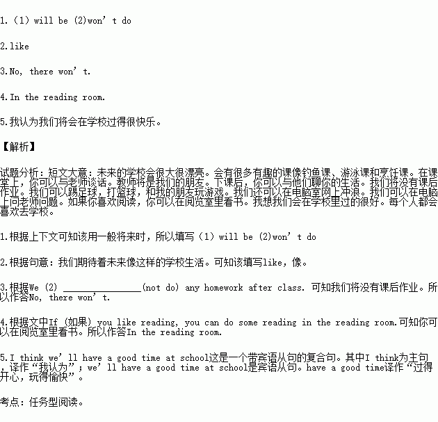 The school in the future will be very big and beautiful. There will be many interesting classes like fishing classes, swimming classes and cooking classes. In class, you can talk with the teachers. The teachers _______________(be) our friends. After class, you can chat(聊天) with them about your life. We ________________(not do) any homework after class. We can play football, play basketball and play games with our friends. We can also surf on the Internet (网上冲浪)in the computer room. We’ll be able to ask the teacher questions on the computer. If (如果) you like reading, you can do some reading in the reading room. I think we’ll have a good time at school. Everyone will like going to school. I look forward to the school life ____________this in the future.