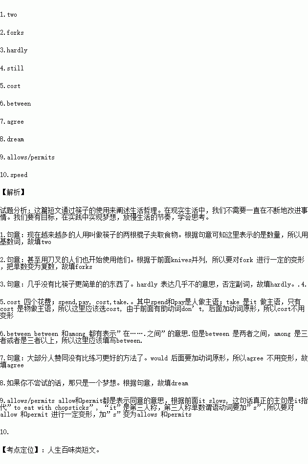 Right now, more and more people are digging into their food with 1. (二) sticks which are called chopsticks. Even people eating with knives and 2. (餐叉) begin to love them. What’s so special about them? Because they have deep influence in many people’s ways of life.