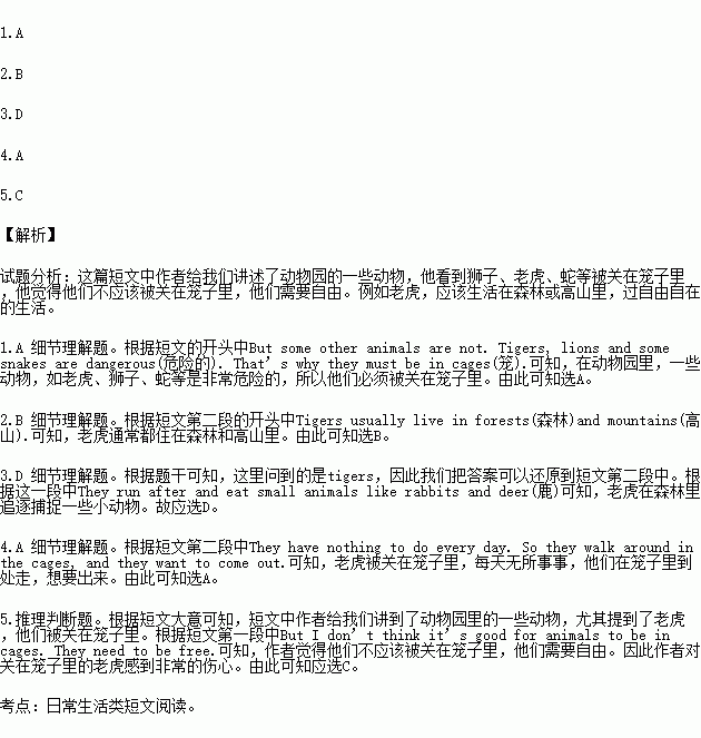 Tigers usually live in forests(森林)and mountains(高山). They are strong and can run very fast(快). They run after and eat small animals like rabbits and deer(鹿), but now they are in small cages. They have nothing to do every day. So they walk around in the cages, and they want to come out. When they are tired, they sleep. I am kind of sorry for them.