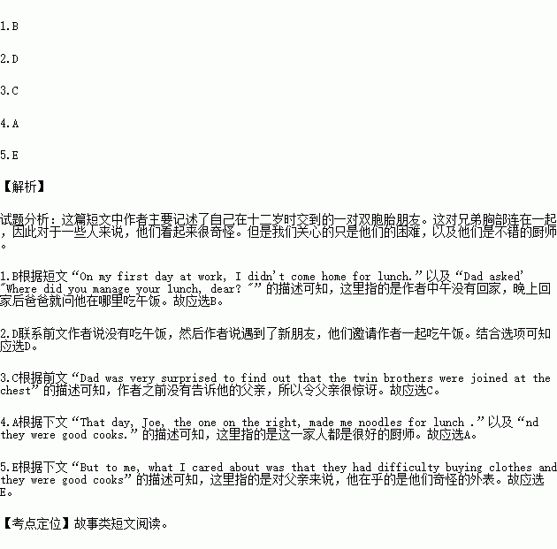 When Dad asked me about this, I said "I know that, too. But do you know that their mom has to make al1 clothes because it's too difficult to find anything to fit them? 4.________ . That day, Joe, the one on the right, made me noodles for lunch . "