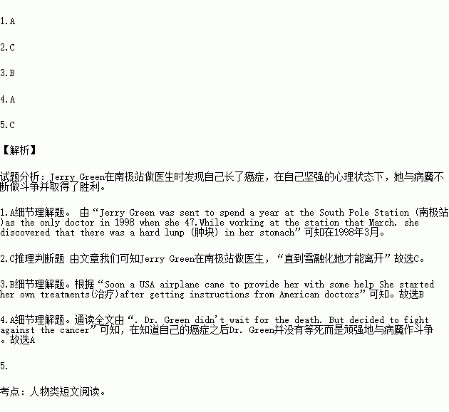 Jerry Green went to spend a year at the South Pole Station (南极站)as the only doctor in 1998 when she 47. While working at the station that March. she discovered that there was a hard lump (肿块) in her stomach. She knew it was cancer, but she wasn't able to go to a doctor for help. She couldn't leave the station for the next seven until the snow thawed. Dr. Green didn't wait for the death. But decided to fight against the cancer. She tried to about the lump to a hospital in the United States. The doctors said it was cancer. Without the proper wouldn't live for long. Soon a USA airplane came to provide her with some help. She started her own treatments(治疗)after getting instructions from American doctors. She finally spent the long winter there before she returned home that October .Since then, she had become a incubus in support of cancer charities. She also wrote a best-selling book called Ice Bound.