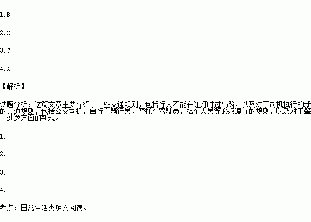 There are rules for bus drivers, too. If bus drivers smoke, drink or make phone calls while driving, they can be fined. Buses that carry too many people are also against the law. Pedestrians will have to walk more safely under the new law. They must cross streets at crosswalks. Also, they shouldn’t climb over the fences (栅栏) along streets.