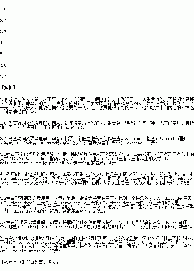The prime minister was called to the palace. When hearing the king’s situation, he said, “Although I have much power, it doesn’t make me . I’m always worried about losing it.” Then, the king’s banker came and said he had lots of wealth, but he also worried about losing it. He was never happy, either. Next, the palace singer came and his words were almost the same.