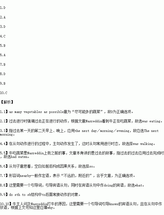 One evening he heard a noise in his garden and looked out of the window.A white ox had got into the garden and________his vegetables.Nasreddin at once took his stick,ran out and chased the ox,but he was too old to catch it.When he got back to his garden,he found that the ox had ruined most of his precious vegetables.