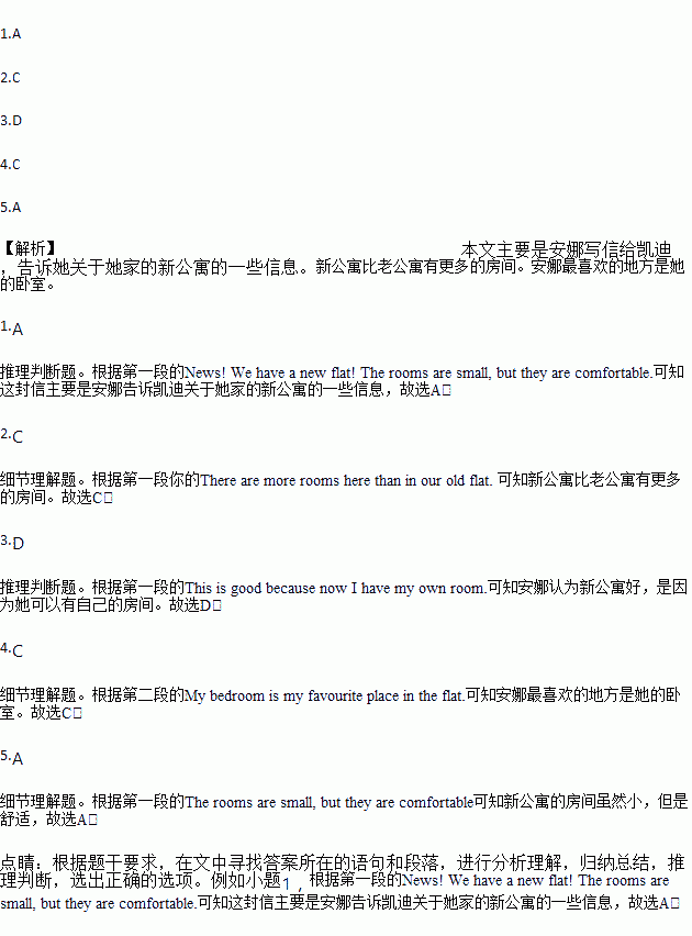 News! We have a new flat! The rooms are small, but they are comfortable. There are more rooms here than in our old flat. This is good because now I have my own room. In the old flat, I have to share a room with my sister.