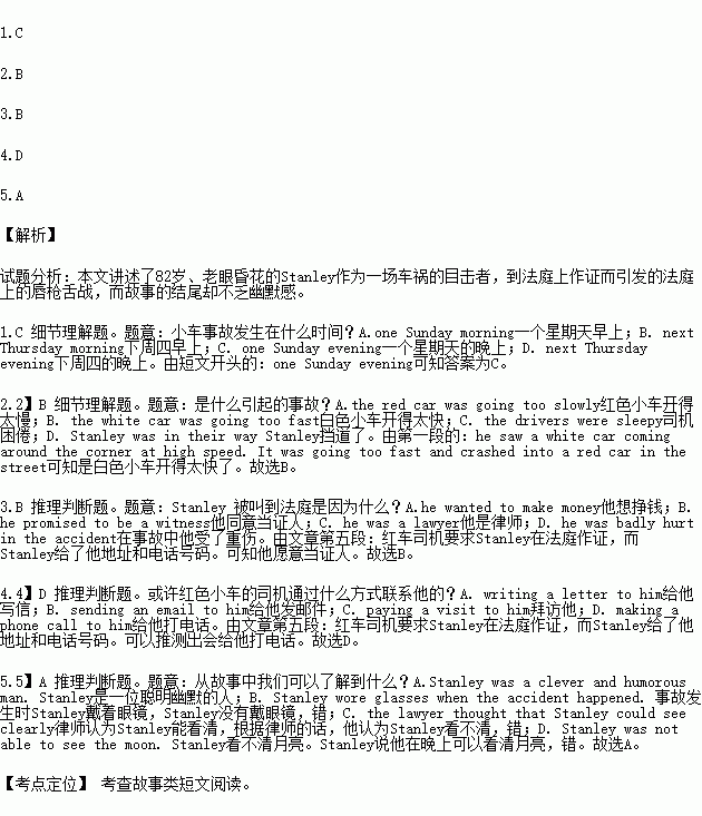 Next Thursday morning, Stanley was asked to go to the court. The lawyer(律师) for the driver of the white car asked him a lot of questions about what he had seen. Then he asked Stanley how old he was.
