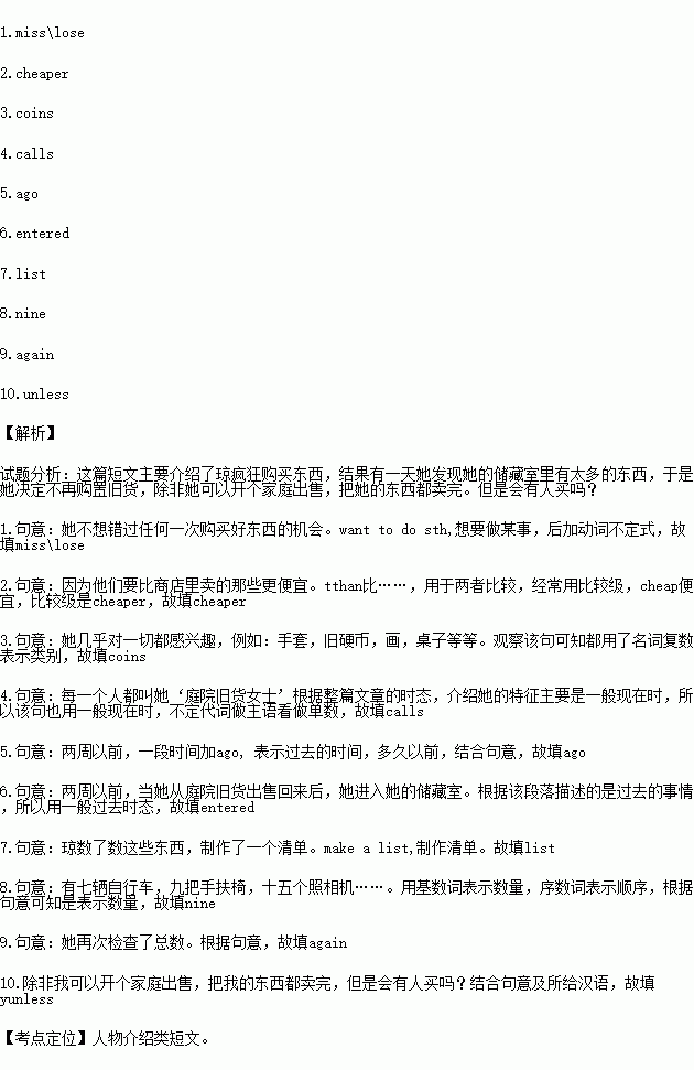 Jean Nicole is a yard sale lover.She appears almost in every yard sale.She doesn’t want to 1.____________(错过)any chance to buy good things,because they are much 2.____________(便宜的)than those in shops.She is interested in almost everything,such as gloves,old 3.___________(硬币),paintings,tables and so on.Everybody4.__________(叫,称呼)her “Lady Yard-sale.”
