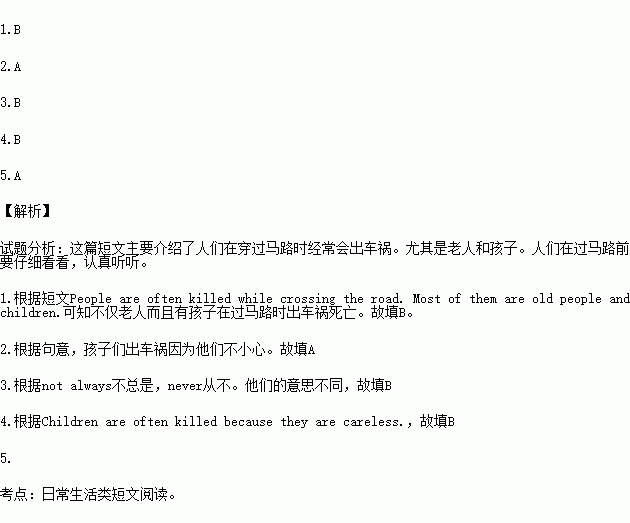 People are often killed while crossing the road. Most of them are old people and children. Old people are often killed because they usually can’t see or hear very well. Children are often killed because they are careless. People should look and listen carefully before they cross the road.