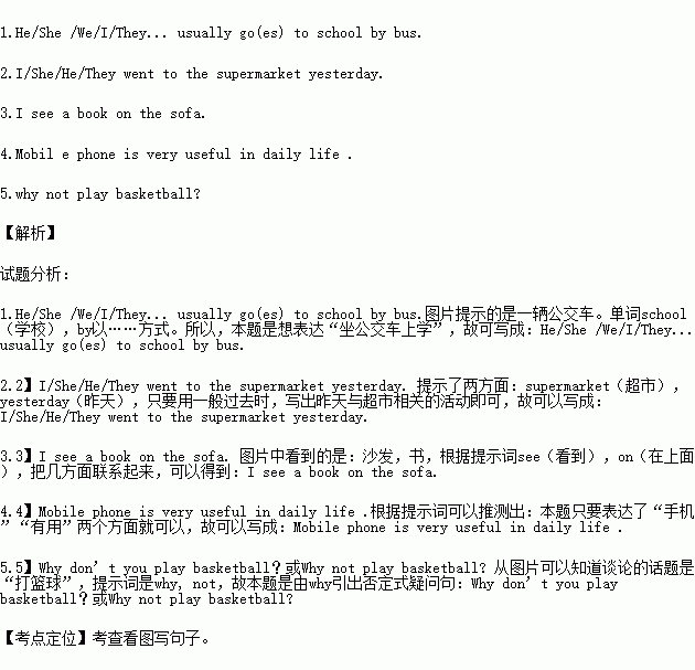 看图写句子。根据图示和所给的词,各写一个完整的句子,(每幅图限写一句话,必须用上所给的词)(共5小题,每小题1分,共5分)