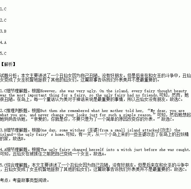 Long long ago, there was a fairy(仙女) on a large island. She was the strongest and cleverest among all fairies. However, she was very ugly. On the island, every fairy thought beauty was the most important thing for a fairy, so the ugly fairy had no friends. Every time she was sent to save someone in trouble, before she could say a word, the person would shout loudly, “Ugly! Get out of here, right now!”
