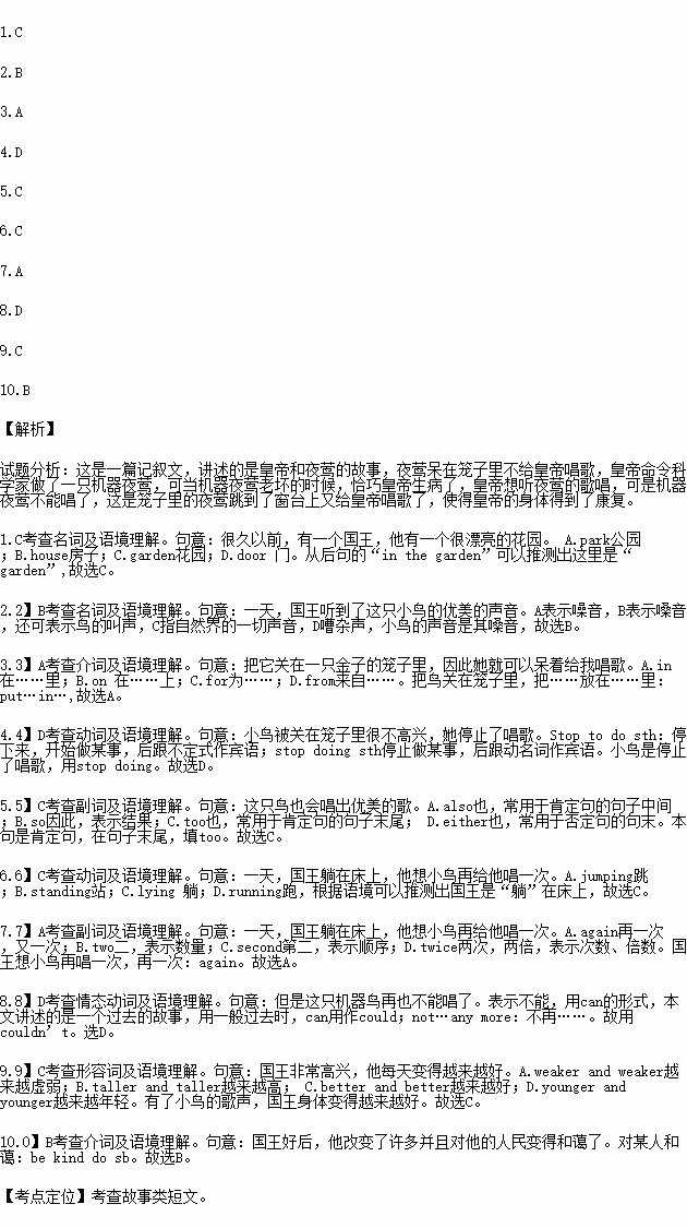 Along time ago, there was an emperor. He had a beautiful . In the garden, there was a little nightingale(夜莺)singing very beautifully.