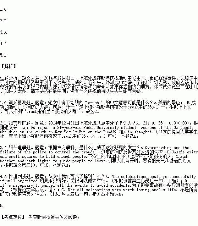 On the night of December31, 2014, a holiday celebration turned into a terrible tragedy. “Overcrowding(过度拥挤) and the failure of the police to contro1 the crowds were the main reasons it happened,” the authorities(官方) said.