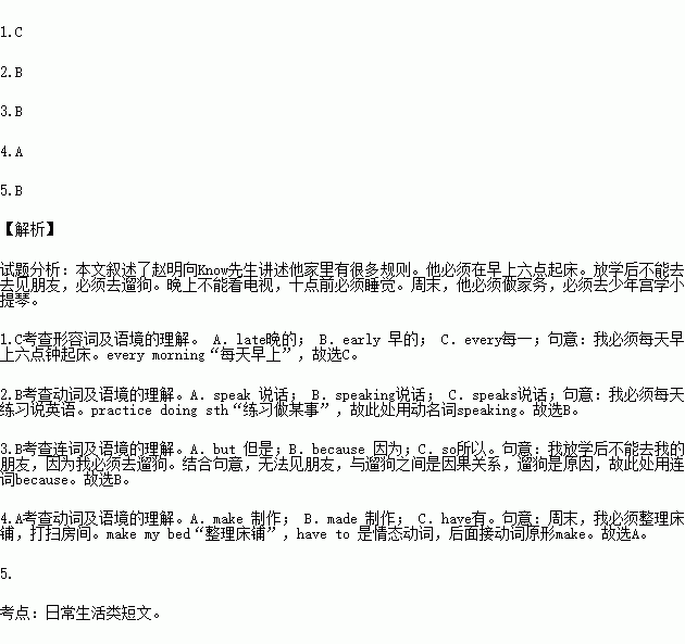 I have lots of rules in my house.I’m not happy.I have to get up at 6 o’clock morning.I have to practice English every day.I can’t see my friends after school I have to walk my dog.I can’t watch TV in the evening.And I have to be in bed by 10 o’clock.On weekends,I have to my bed and clean my room.Then I have to wash the clothes. Later I have to go to the Children’s Palace to learn the violin.I never have .What can I do?