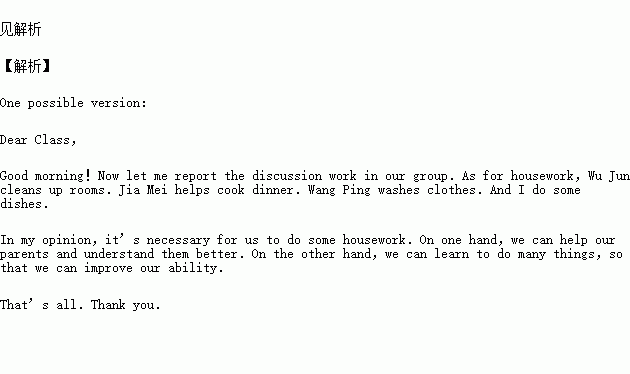 在一堂英语课上,老师组织全班同学开展有关“做家务”的讨论。假如以下是你所在的小组的讨论记录,请你根据这个记录用英语向全班作一个汇报。