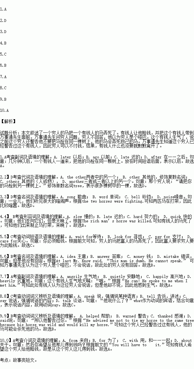 But the rich man said, “I shall tie my horse as I like!” he tied up his horse and had his lunch nearby. After a moment they heard a loud , the two horses were fighting. They went up to them, but it was too . The rich man’s horse was killed. “See what your horse has done!” cried the rich man. “You will have to it.” And he brought the poor man before Mr. Know.