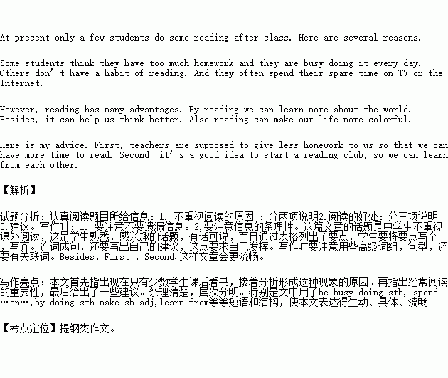 阅读使人明智,阅读使人充实。阅读的好处很多,但是,目前许多中学生都不重视阅读。请你根据下表内容写一篇80-100字的英语短文,对这一现状进行分析并提出建议。文能出现真实的人名、校名和地名。开头已给出,不计人总词数。(15分)