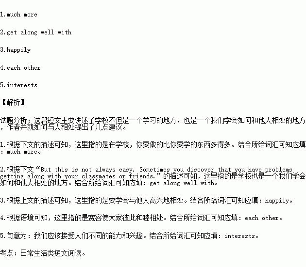 You may not realize it, but you are doing 1. than just studying when you are at school. School is also the place where you learn to 2. people. But this is not always easy. Sometimes you discover that you have problems getting along with your classmates or friends. The most important thing to learn is tolerance(宽容). Tolerance is the ability to realize and respect the differences in others. We cannot change the way that other people do, so it is important to learn to live 3. with them.