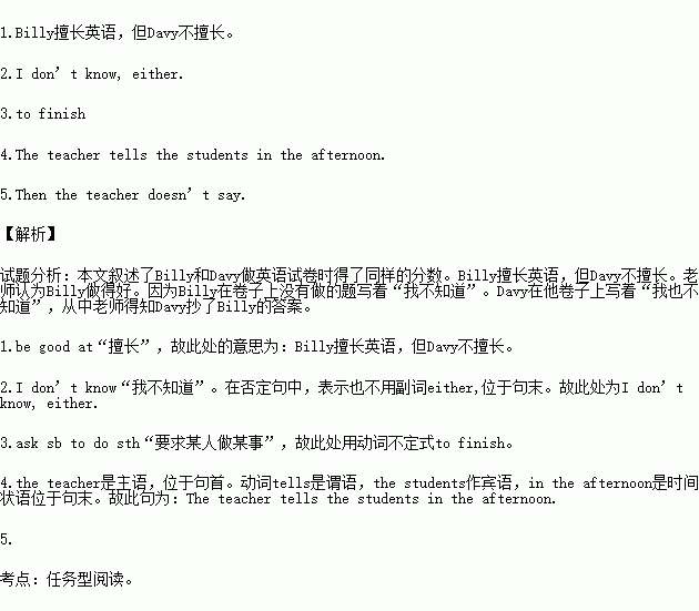 teacher,in, the, tells, afternoon, the ,students, the:“Billy and Davy get the same mark(分数),and a good mark.But I think Billy is better.” “What?”Davy is angry(生气). Then the teacher says “In Billy's paper,he can't finish a hard question,so he writes ‘I don't know’,but on Davy's paper,he writes ‘(B)我也不知道.’”