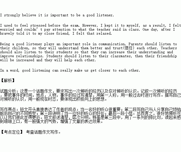在生活中,人们常用有一些快乐需要分享,烦恼需要倾诉,这时就需要一个好的倾听者。请以Be a good listener 为题写一篇短文,内容必须包括以下要点: