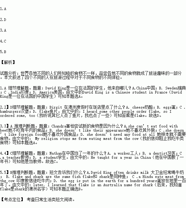 Chandra is a dentist in Texas. She is from India. “ I’m afraid to try new foods because maybe there is beef in them. I’m a Hindu(印度教信徒)and my religion(信仰) stops me from eating meat from the cow. That’s why I can’t eat hamburgers or noodles with meatballs.” |