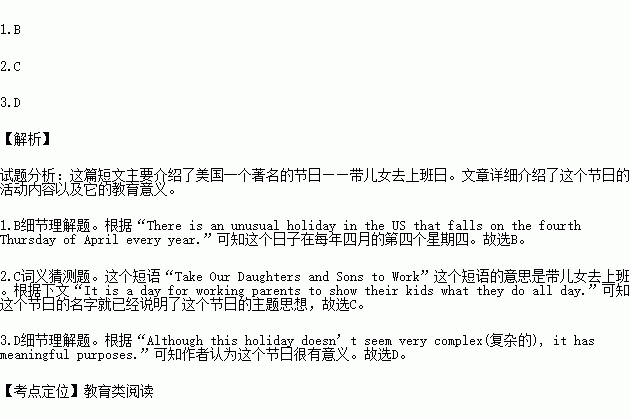 There is an unusual holiday in the US that falls on the fourth Thursday of April every year. It is very different from Christmas, Thanksgiving, or other well-known holidays. It is called Take Our Daughters and Sons to Work Day. This holiday is meant to be educational as well as fun. The idea is simple, and the name says it all. It is a day for working parents to show their kids what they do all day.
