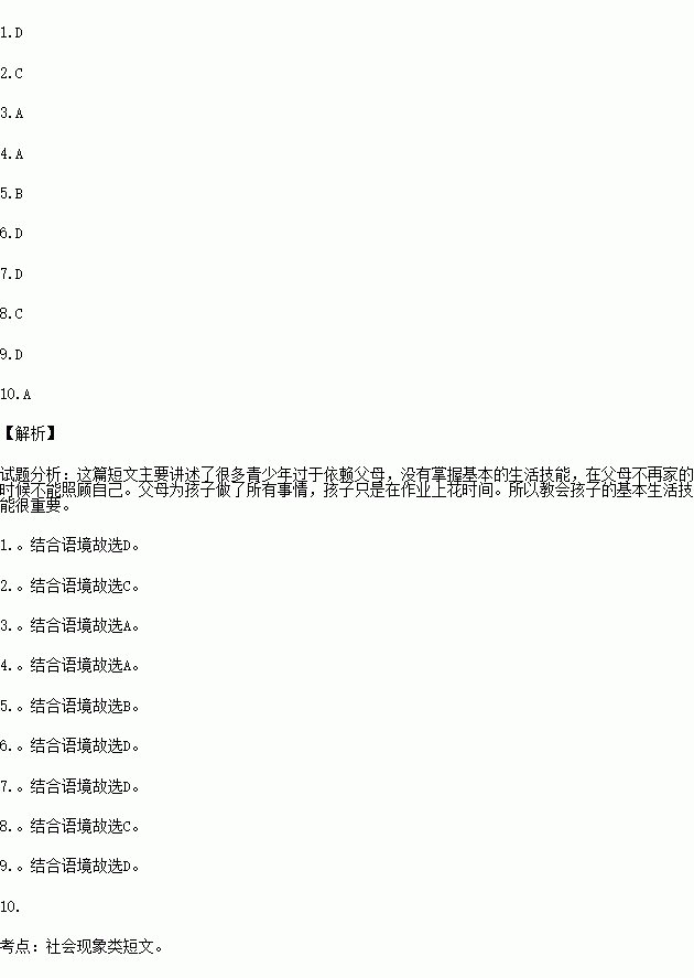 Most teenagers only have time for their ___.They don’t learn any life skills until they go to college. However, Sima Yige doesn’t think so. “I think I’d be all right. I wouldn’t just eat sandwiches or fruit. I know how to cook some ______ dishes because my mum showed me,” the 13-year-old boy said. In his opinion, many teenagers depend(依靠) too much on their parents, and there is much more to learn than cooking, like “______ up your room or even dressing yourself properly”.