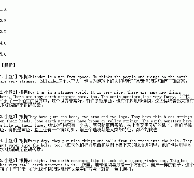 Shlander is a man from space.He thinks the people and things on the earth are very strange.He is now writing a letter to his friend at home.Here is a part of his letter.Read it and answer the questions.