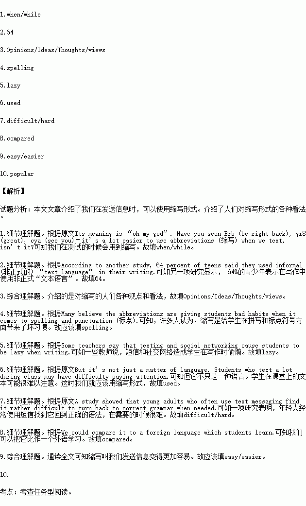 Conclusion | Using abbreviations can make it 9. to send text messages. No matter it’s good or bad, “text language” is becoming more and more 10. . |