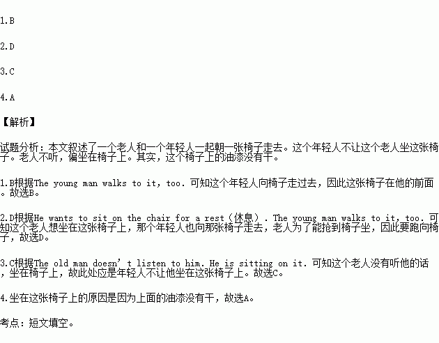 A young man and an old man are walking in the park.The old man is behind(在后面) the young man. _1.__ The old man is very glad to see the chair.He wants to sit on the chair for a rest(休息).The young man walks to it,too. 2. Now he is in front of(在前面) the young man.The young man says.“ 3. ” The old man doesn’t listen to him.He is sitting on it.He looks happy:The young man comes over to him.He is holding a small board(木板)in his hand.It says,“ 4. ”