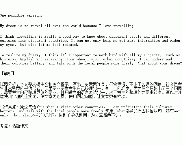 根据中文和英文提示,写出一封意思连贯、符合逻辑、不少于50词的回信。信的开头和结尾已给出,其词数不计入所要完成的回信内。所给英文提示词语供选用。请不要写出你的真实姓名和校名。