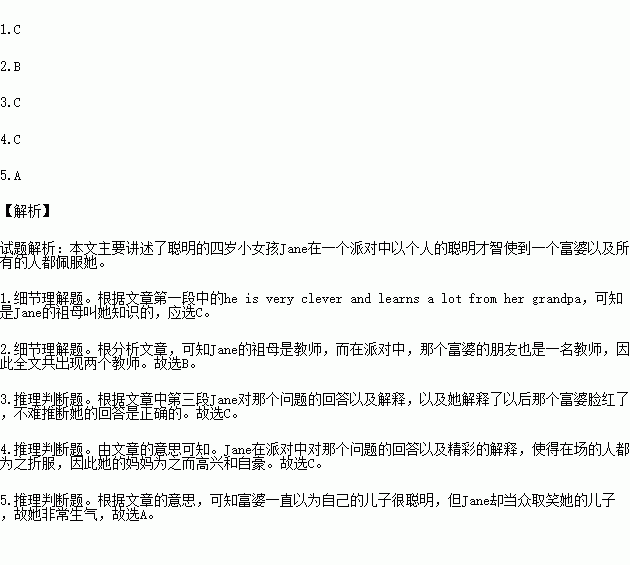 Jane is only four years o1d and she doesn't go to school. But she is very clever and learns a lot from her grandpa—an old teacher. One day, Jane's mother, Mrs John takes her to a party. The guests(客人)all praise(表扬)a rich woman's son. Mrs John asks him a few questions, but his answers are wrong. Jane begins to laugh.