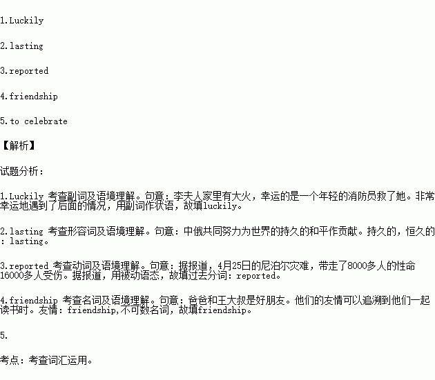 1.There was a big fire in Mrs. Li’s house. (luck) she was saved by a young fireman.