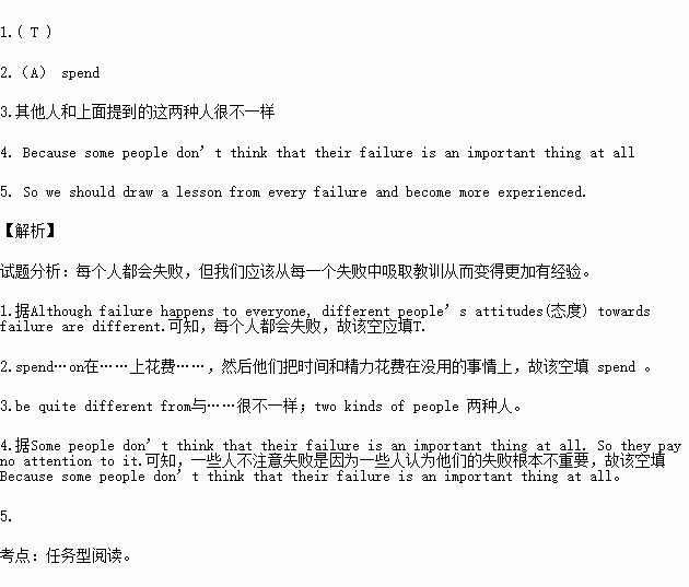 Some people don’t think that their failure is an important thing at all. So they pay no attention to it. As a result, they will have the same failure later. Some people think they themselves are fools and lose their hearts in everything after they get a failure. Then they(A)______(花费)their time and energy on useless things. At last, they may really be fools as they have thought.