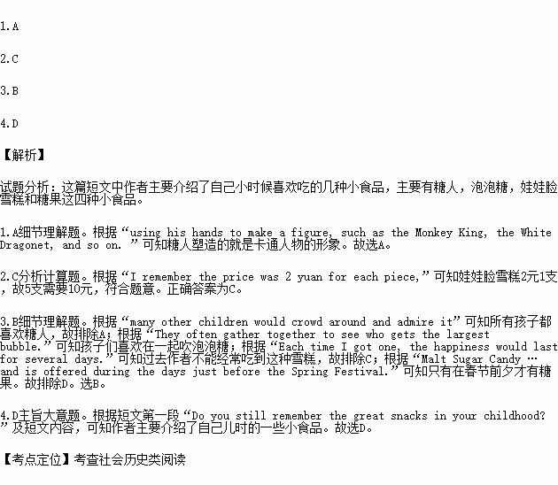 In the old days, you could always find people making sugar figures at the school gate. First, the maker would take a little maltose(麦芽糖)with a small spoon, using