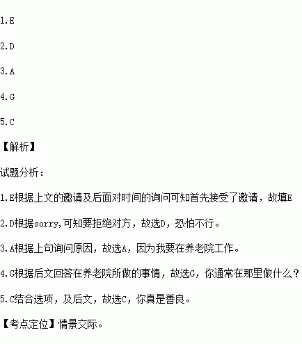 A. Because I’ll work in an old people’s home. B. I don’t agree with you. C. It’s very kind of you. D. I’m afraid not. E. Yes, I’d love to. F. Where would you like to go? G. What do you usually do there? |