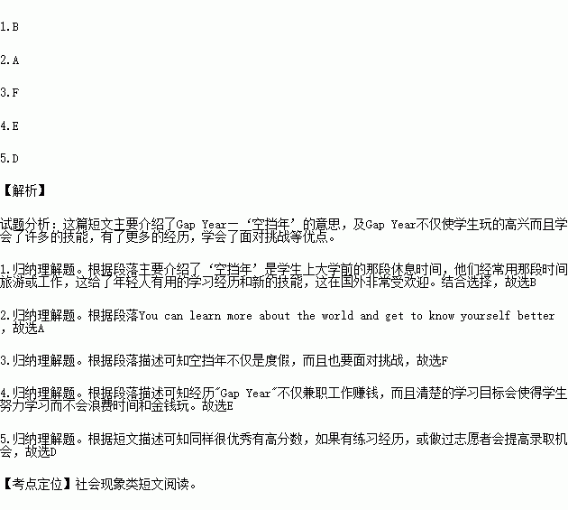 3.A gap year is not only a time to take a vacation, but also a time to face challenges. Gap year students usually work, volunteer or take service projects. You have to learn how to get along in the real world. This process isn't always easy, but it is an important part of growing up. Only in this way can you enjoy life and have fun.