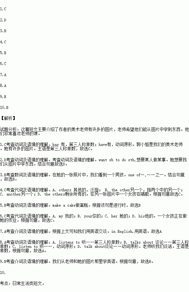 Miss Guo is our art teacher. She some pictures. Every class, she shows those pictures to us. She wants us something from them. In of her pictures, we see a boy. He’s cleaning the room. In picture, a girl is singing. She’s singing an English some. In other pictures, we see others doing different things. One is running, another is a cake. And a girl is doing homework. We lok at our teacher and her pictures. We talk English and our teacher us. We learn English our teacher and her pictures. Our teacher likes . We likes her class, too.