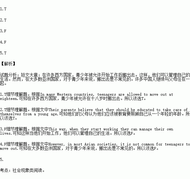 Should teenagers be asked to move out when they start working? In many Western countries, teenagers are allowed to move out at eighteen. Their parents believe that they should be educated to take care of themselves from a young age. This way, when they start working they can manage their own lives. However, in most Asian societies, it is not common for teenagers to move out. Chinese parents believe that it is better for children to live with parents who can take care of them. But the young should then look after their parents as they get older. That is why many Chinese adults continue to live with their parents.