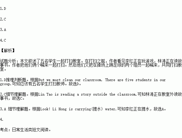It is five o’clock in the afternoon. It’s time to go home. But we must clean our classroom. There are five students in our group. Now there are only three. Li Hong is playing games. Lin Tao is reading a story outside the classroom. I say to them, “ Please come and clean our classroom!” We begin to clean it. Look! Li Hong is carrying(提水) water. Lin Tao and I are cleaning the floor. Soon we finish it. Where are the other two students in our group? We look for them and find them playing soccer on the playground. So we play soccer together(一起) with them.
