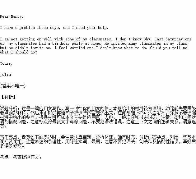 假如你叫朱迪,写一封信,把你的烦恼告诉你最好的朋友南希。这几天你发现同学们对你不太友好。上个星期日,你班的一位同学办生日聚会,她邀请了班上的很多同学,但没有邀请你。你感到很烦恼,于是向南希诉说此事,并向她求助。60词左右。