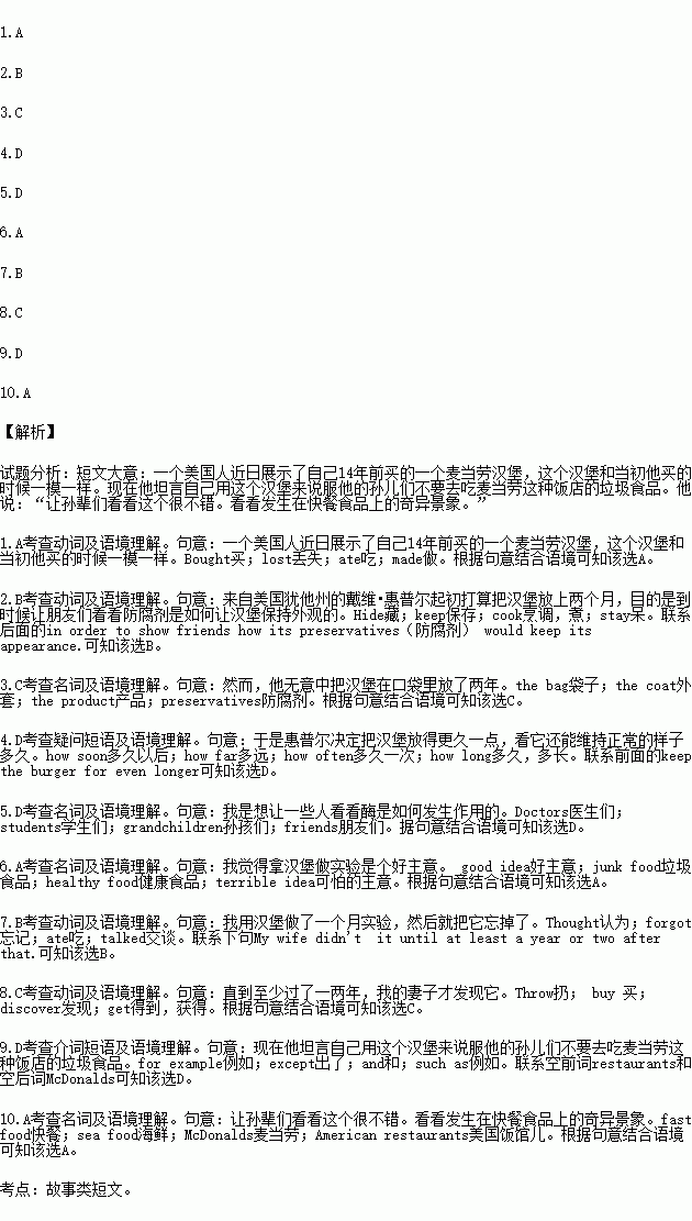 David Whipple, from Utah, had originally(起初) planned to the burger for two months in order to show friends how its preservatives(防腐剂) would keep its appearance.