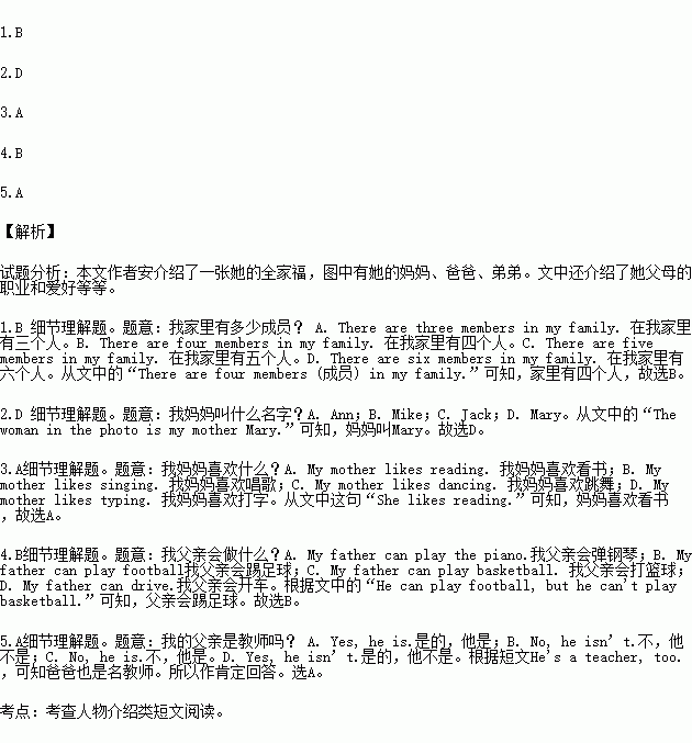 Hello, I’m Ann. This is a photo of my family. There are four members (成员) in my family. The woman in the photo is my mother Mary. She is a teacher. She likes reading. The man is my father Jack. He's a teacher, too. He can play football, but he can't play basketball. Look, the lovely baby is my brother Mike. I like my family very much.