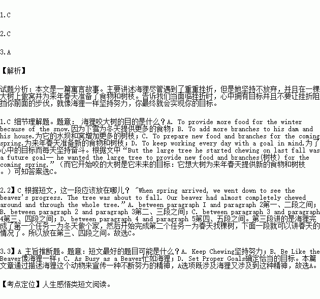 2.Here is。paragraph(段)"When spring arrived, we went down to see the beaver's progress. The tree was about to fall. Our beaver had almost completely chewed around and through the whole tree.”According to the passage, it should be put______