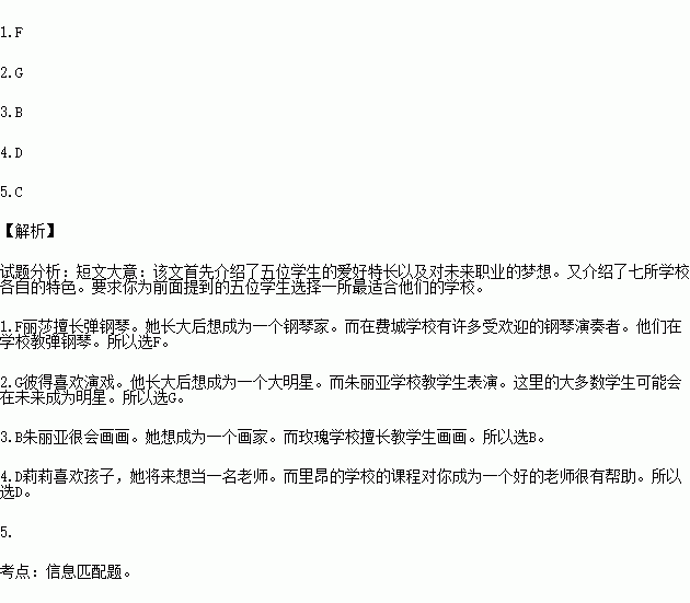 1. Lisa is good at playing the piano. She takes piano classes every Saturday. She wants to be a piano player when she grows up. 2.Peter is in the acting club. He likes acting a lot. He wants to be a big star when he grows up. 3. Julia can draw very well. She wants to be an artist. Will her dream come true? 4. Lily likes children and she can get along well with them She wants to be a teacher in the future. 5.Tina wants to be a nurse. She can take care of others well. Now she is studying hard to make their dream come true. | A. Holy City School Holy City School teaches math well. If you are interested in math, we welcome you to our school. You can learn a lot in our school. B. Rosary School Walking in the Rosary School, you can see many pictures on the wall. All these pictures are drawn by the students in the school. C. Oakland School If you want to be a nurse, Oakland School is a good choice(选择). It’s very for its nursing lessons. D. Lyon School There are many kinds of lessons in Lyon School. And the teaching lessons are the best. The lessons are very helpful to make you a good teacher. E. Music & Dance From the name you can know it is a good school for students to learn music and dance. It will be fun to study here. F. Philadelphia School There are many popular piano players in Philadelphia School. They teach in the school. If you want to meet them, you can come and study here. G. Julia Show School Julia Show School teaches students to act. Most students here may be stars in the future. It’s not only interesting but also promising(有前途的)to study here. |