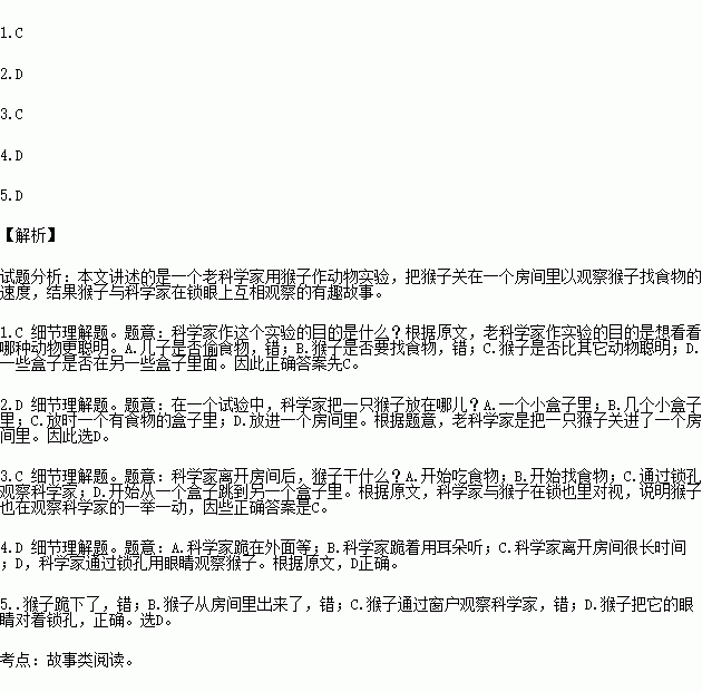 In one test the old scientist put a monkey in a room where there were several boxes. Some boxes were inside other boxes. One small box had some food in it. The scientist wanted to watch the monkey and to find out how long it would take the monkey to find the food. The scientist left the room. He waited a few minutes outside the door. Then he got down on his knees and put his eyes to the keyhole(锁孔). What did he see? To his surprise, he found himself looking into the eye of the monkey. The monkey was on the other side of the door and looked at the scientist through the keyhole.